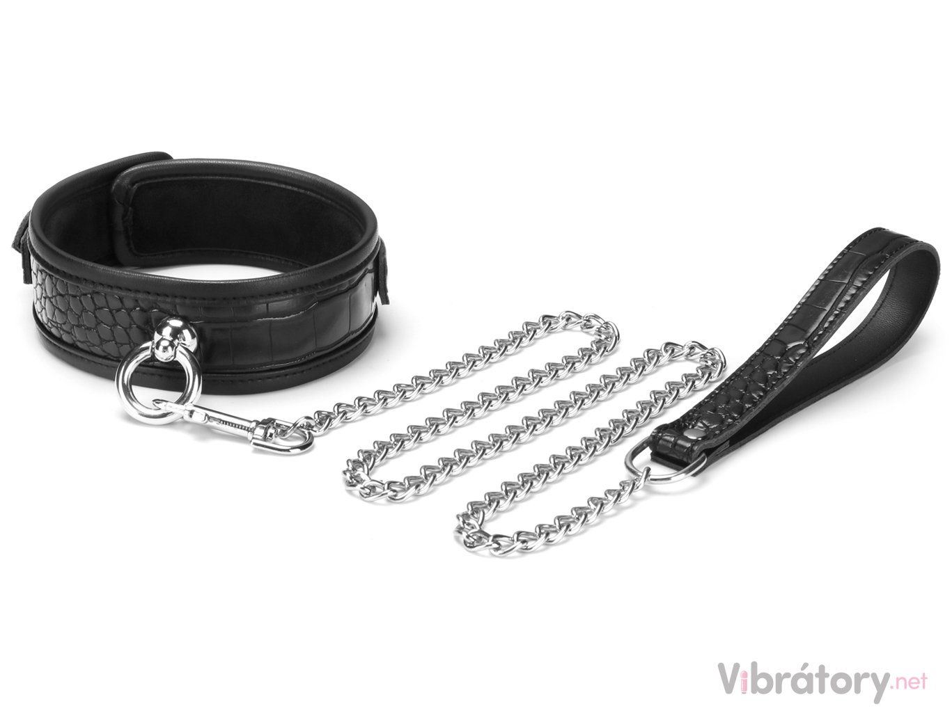 - Obojek s vodítkem – pro ovládání partnera. Z vnitřní strany je měkce polstrovaný plyšem pro větší komfort. Má zapínání na přezku a řetízkové vodítko, které k němu připnete pomocí karabinky.