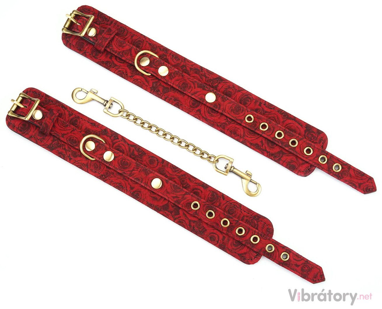 Pouta na nohy Red Rosy jsou vyrobená z jehněčí kůže s potiskem s motivem růží a změkčená pro větší pohodlí během nošení. Jsou spojená kovovým řetízkem s karabinkami a mají zapínání na přezku, takže si snadno přizpůsobíte jejich velikost.  Více
