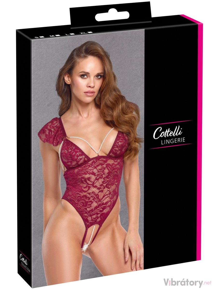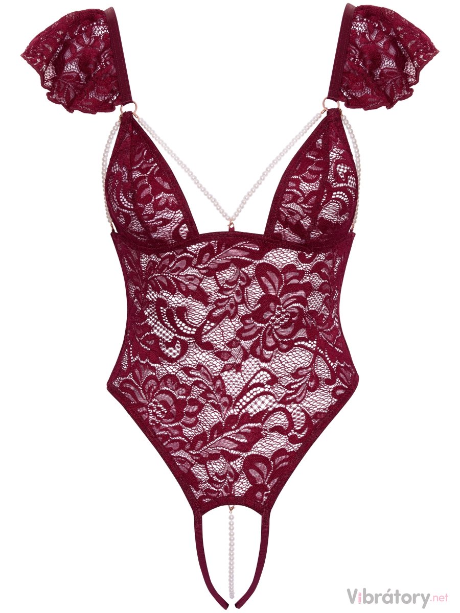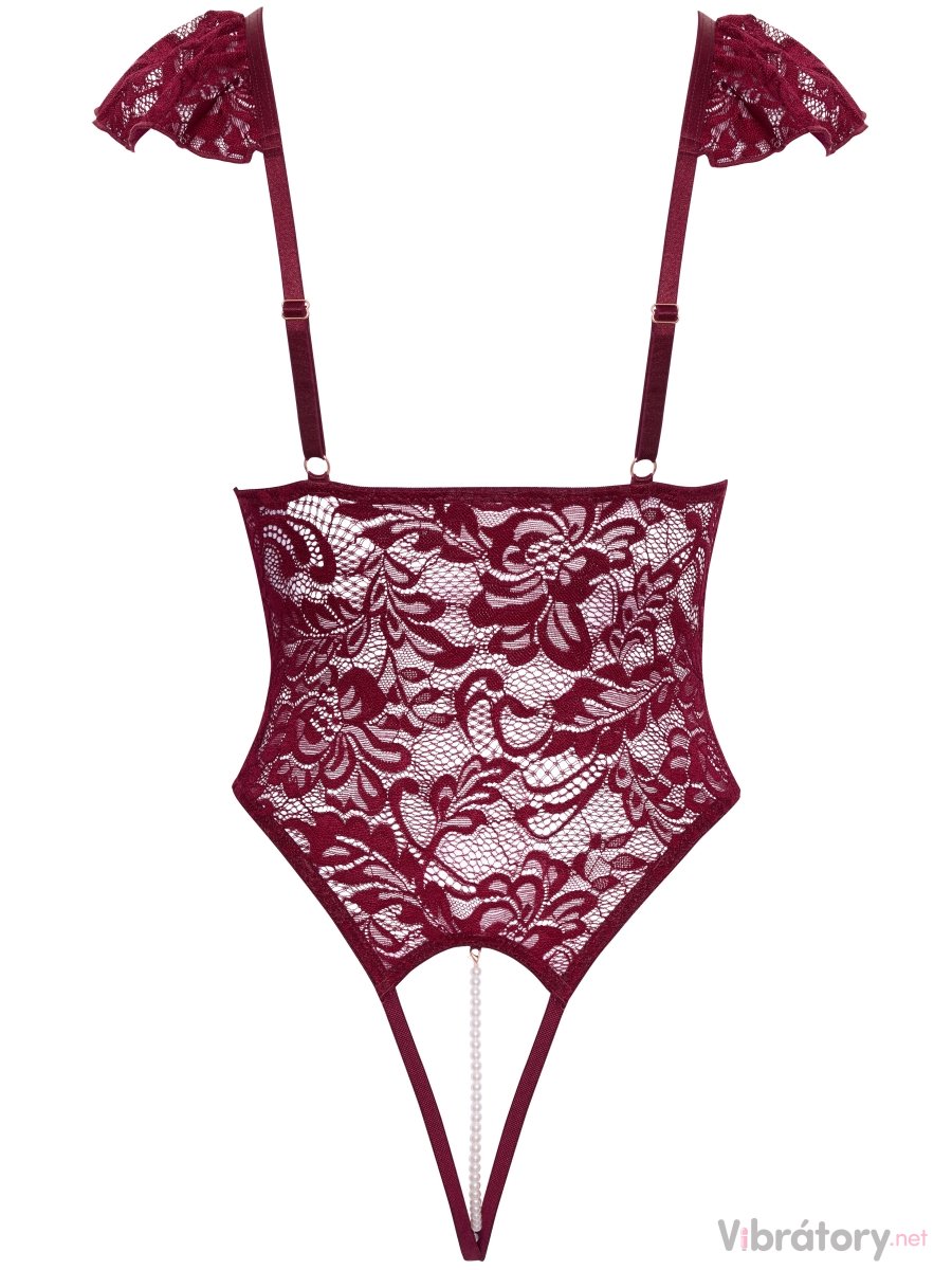 Má hluboký výstřih, délkově nastavitelná ramínka a otevřený rozkrok, který usnadňuje přístup k intimním partiím i zadečku. Perlové řetízky jde snadno odepnout. Více