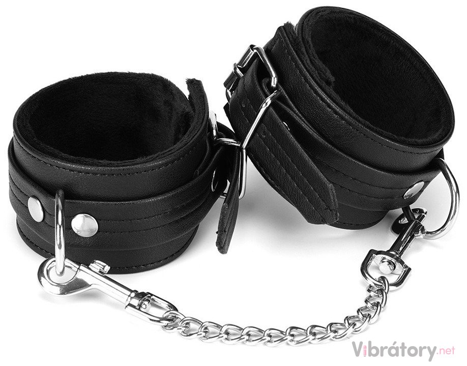 Mají zapínání na kovovou přezku a jsou spojená kovovým řetízkem s karabinkami. Více