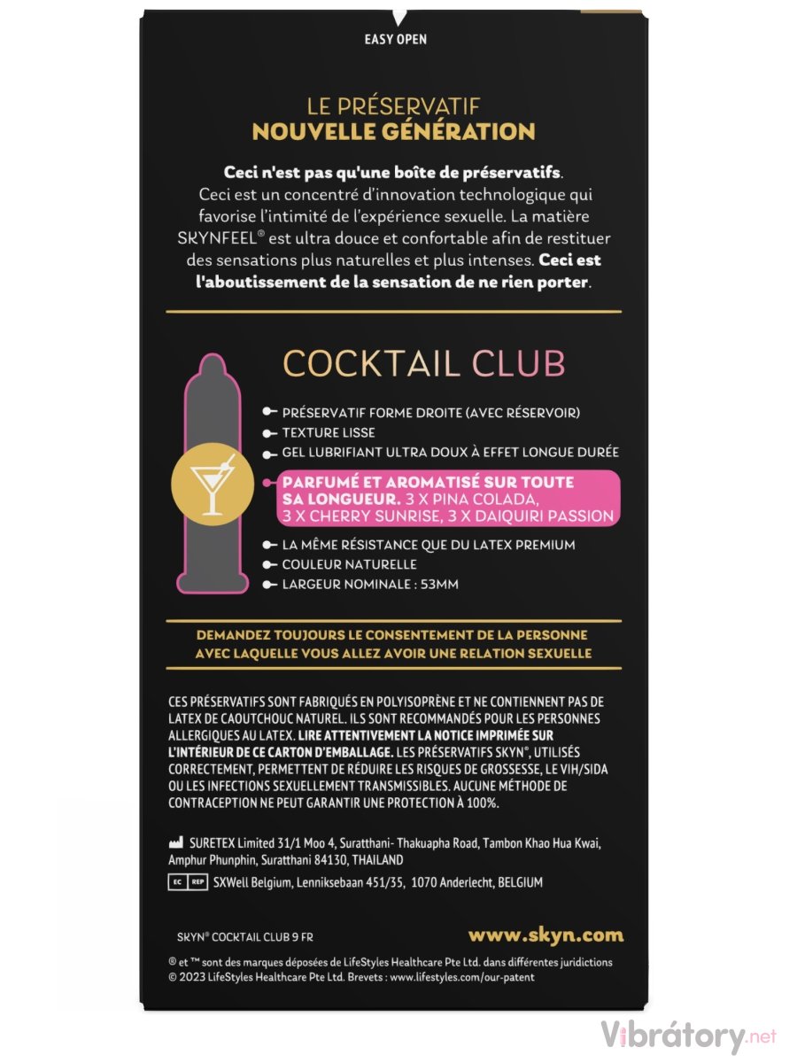 SKYN Cocktail Club mají chuť a vůni známých koktejlů – 3× Piña Colada, 3× Cherry Sunrise a 3× Passion Daiquiri. Jsou extra tenké pro intenzivnější prožitek a vyrobené z měkkého polyisoprenu – neobsahují latex, při sexu je téměř neucítíte a jsou vhodné i pro osoby s alergií na latex.  Více