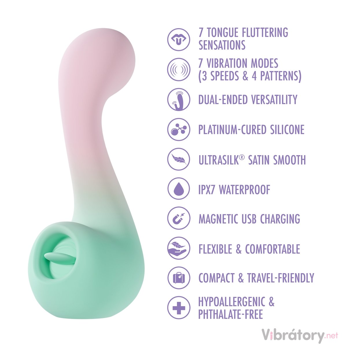 Melody je oboustranný – jedna strana funguje jako klasický vibrátor na bod G, druhá jako stimulátor klitorisu s jazýčkem, který svým pohybem simuluje orální sex.